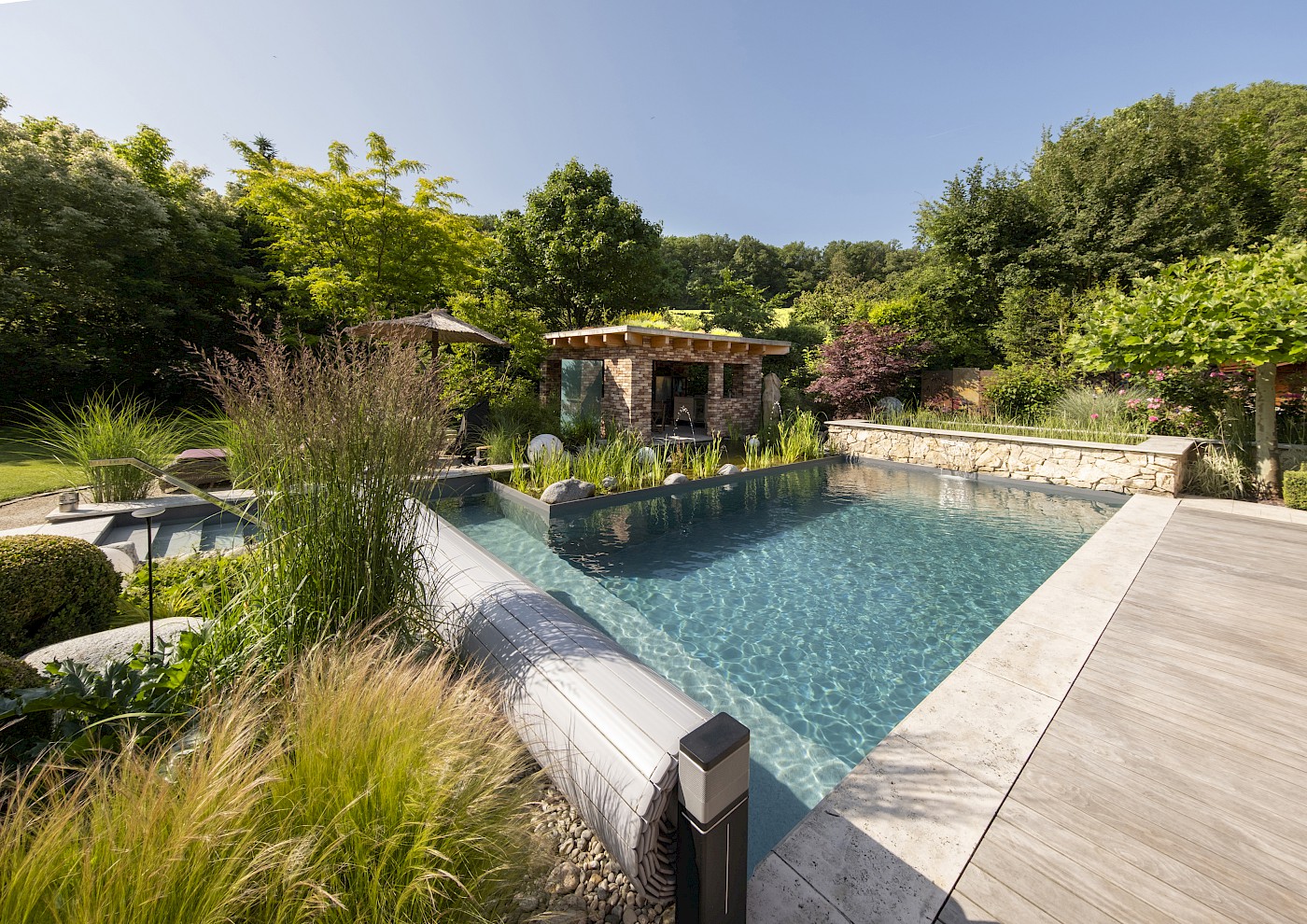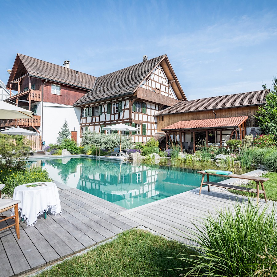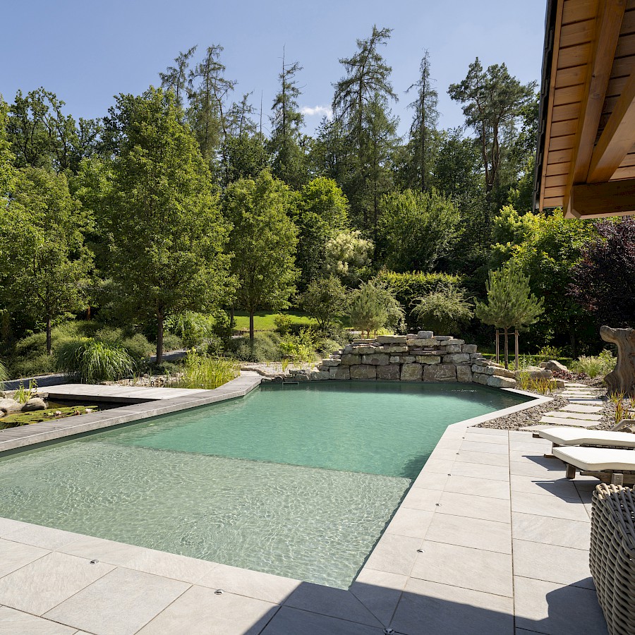 Ein Schwimmteich verbindet den Charme eines Natursees mit modernem Poolkomfort. Kristallklares Wasser, sanft bepflanzte Uferzonen und ein biologisches Filtersystem schaffen ein einzigartiges Badeerlebnis – ganz ohne Chemie. Pflanzen und Mikroorganismen übernehmen die Filterung, reinigen das Wasser kontinuierlich und halten es angenehm weich für Haut und Haare. So entsteht ein gesundes, hautfreundliches Badevergnügen für die ganze Familie.
