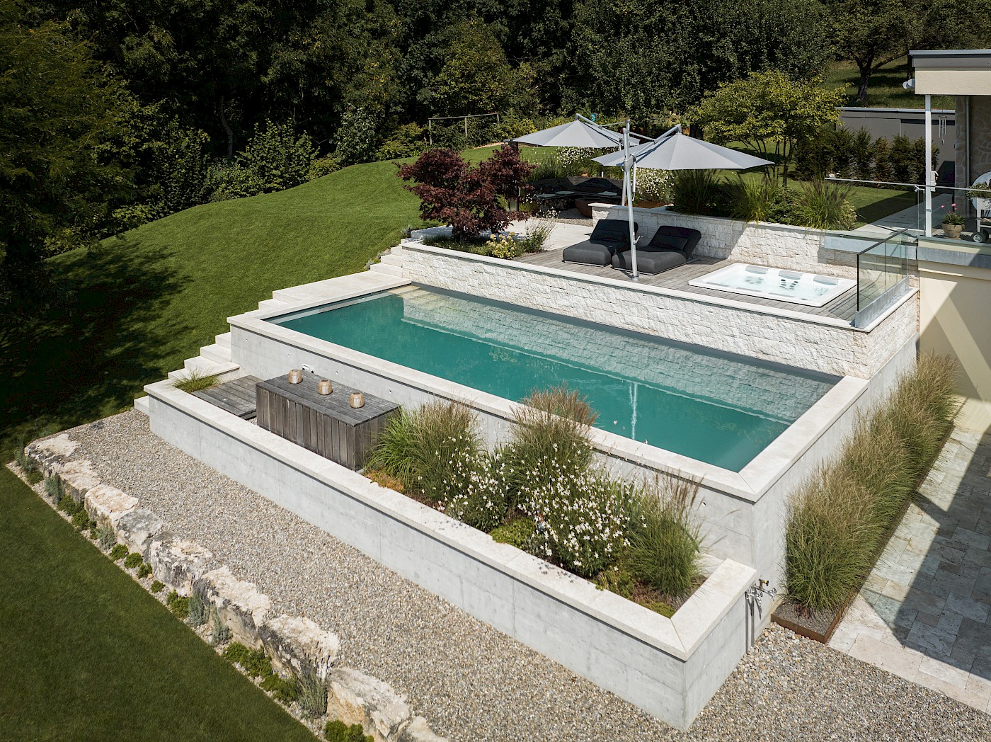 Optional können Sie Ihren Schwimmteich mit Gegenstromanlage, Heizung oder kleinen Wasserfällen ausstatten, sodass er sowohl für sportliches Training als auch für entspannte Stunden geeignet ist. So entsteht ein individuelles Naturparadies, das sich harmonisch in Ihren Garten einfügt und höchsten Komfort mit nachhaltiger Technik vereint.