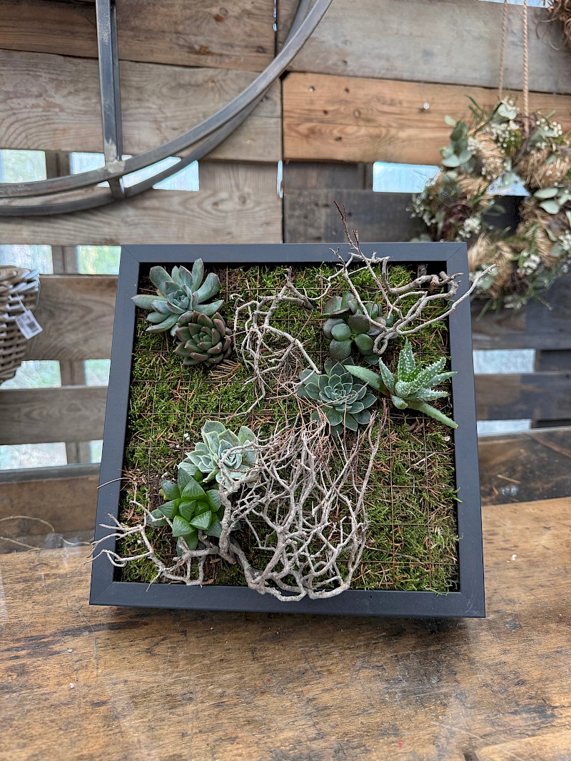 In diesem Workshop gestaltest Du Deinen eigenen „Botanical Frame“ – ein dekoratives Pflanzenbild aus verschiedenen Sukkulenten. Zeitlos, pflegeleicht und ein echter Hingucker für Wand oder Regal.